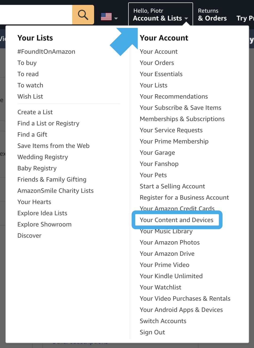 2. Go to Account & Lists » Your Content and Devices.