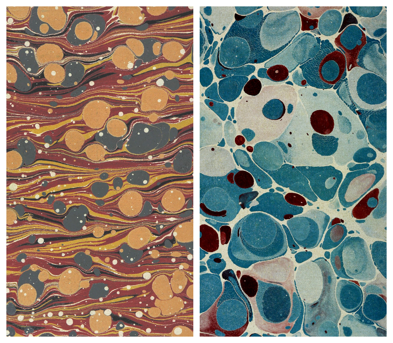 Obviously, many other marble paper designs were used to produce notebook covers. Some of them – although not as legendary as the original speckled pattern – are breathtaking, naming only a few examples digitized by the Bergen Public Library, shown below.