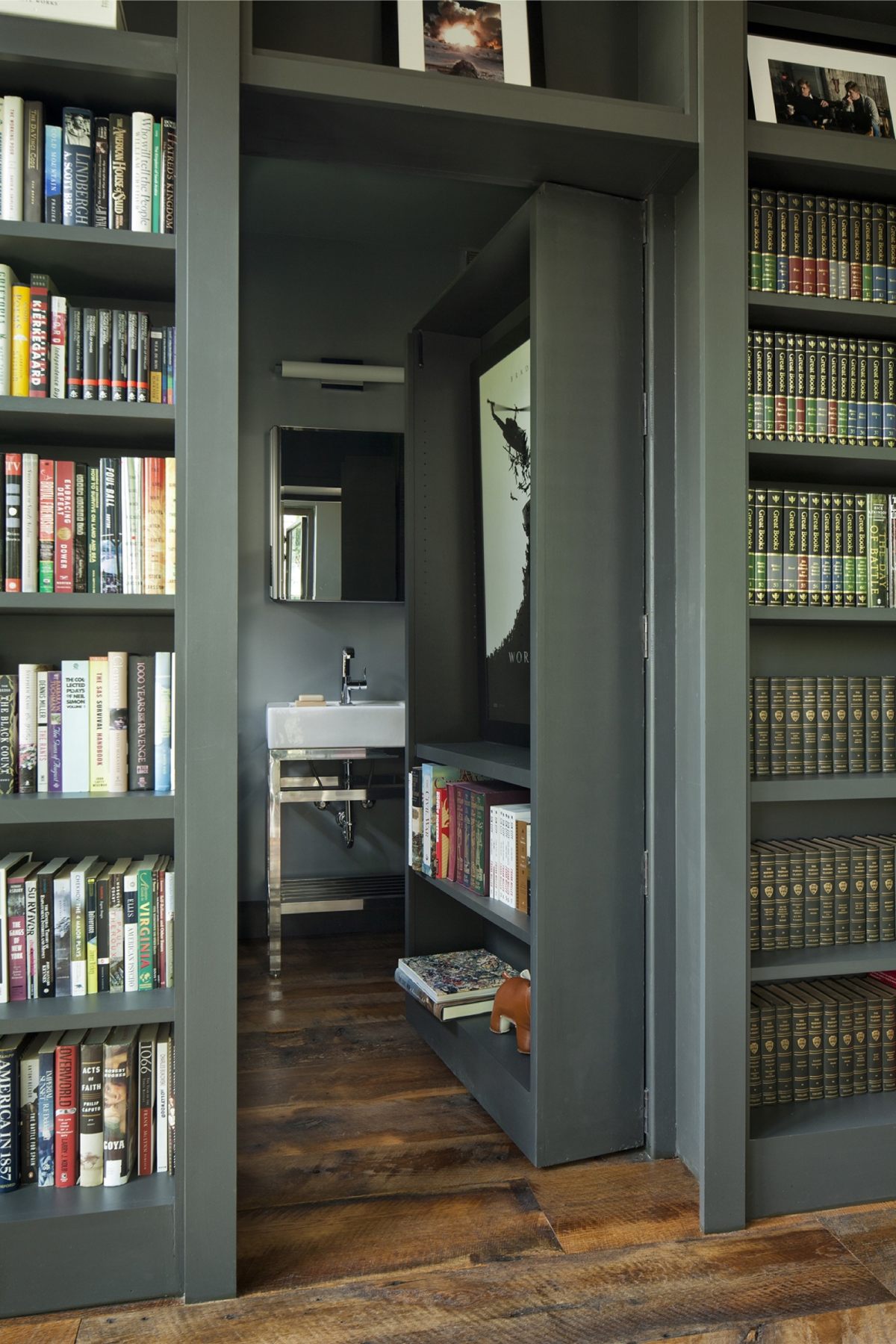 Folding glass doors give the studio a strong connection to the outdoors. Inside, two columns of bookcases roll open to reveal a half-bath and storage area.
