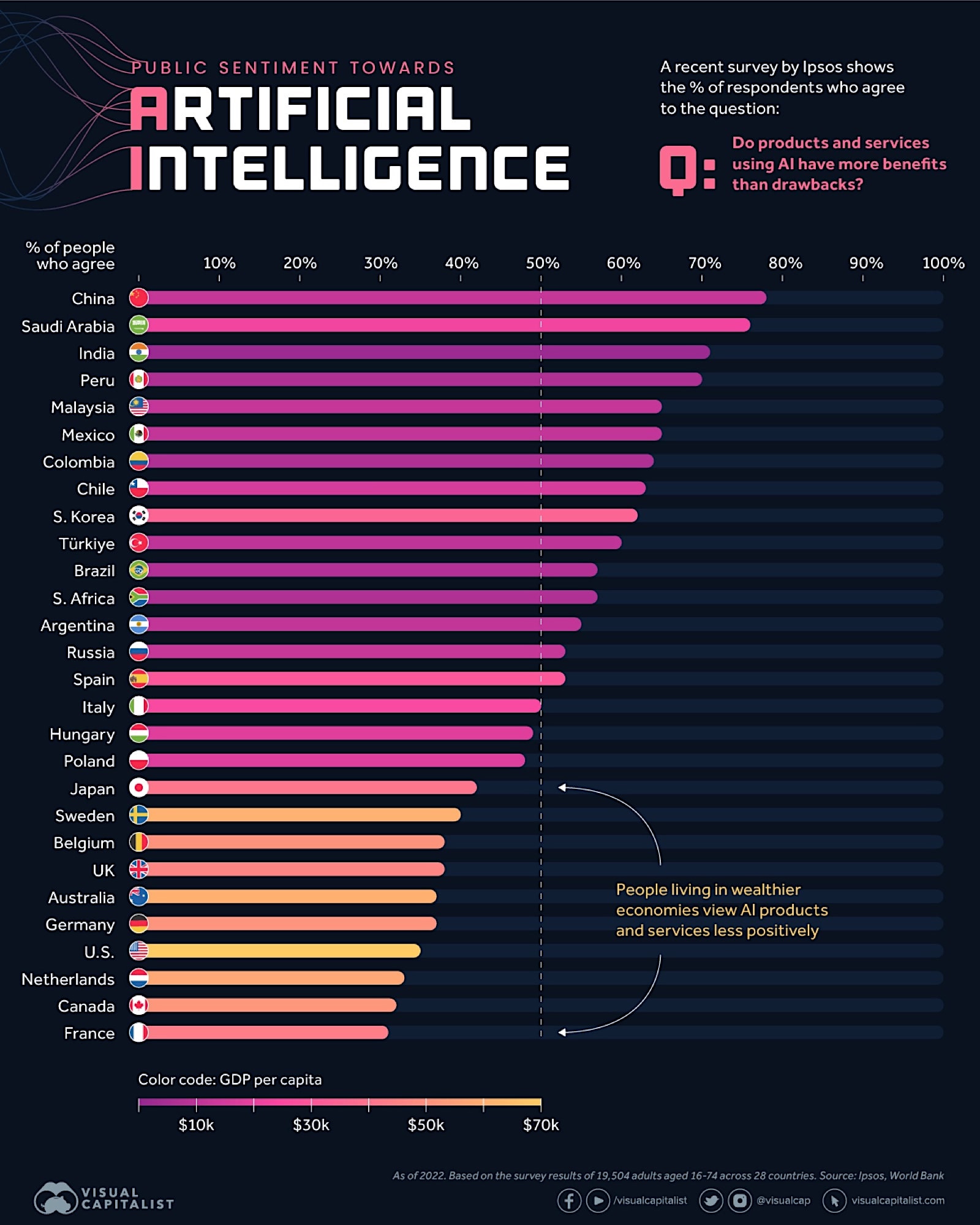 The Visual Capitalist released a single-minded infographic that’s based on the Ipsos survey. It compares public sentiment towards artificial intelligence, and includes GDP per capita.