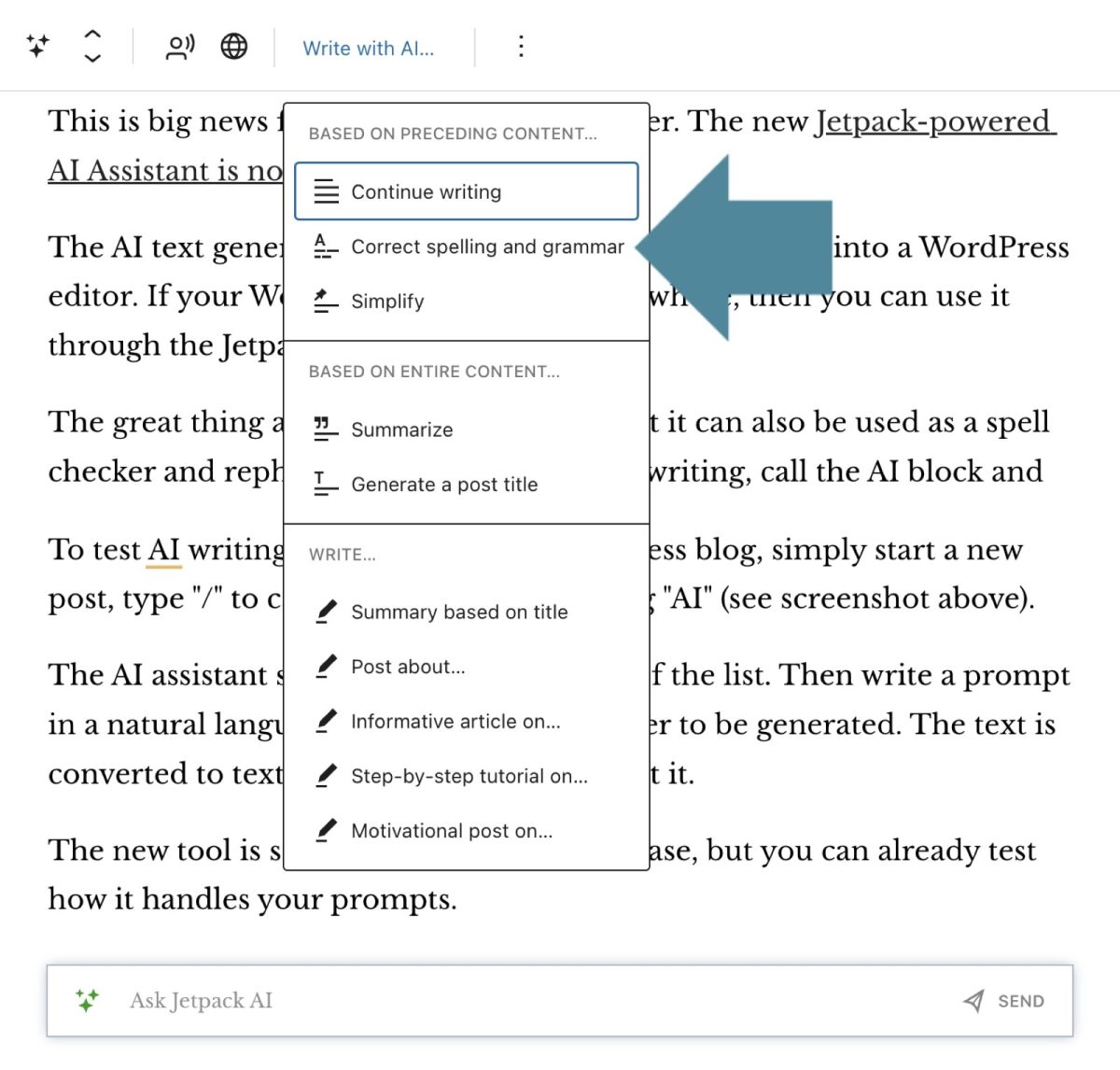 One of the most popular AI writing assistants in WordPress is Jetpack AI. This powerful tool scans your content as you write and suggests improvements in real-time. It checks for spelling and grammar errors, helps you improve sentence structure, and even suggests additional phrasing and wording to make your content more engaging and compelling.