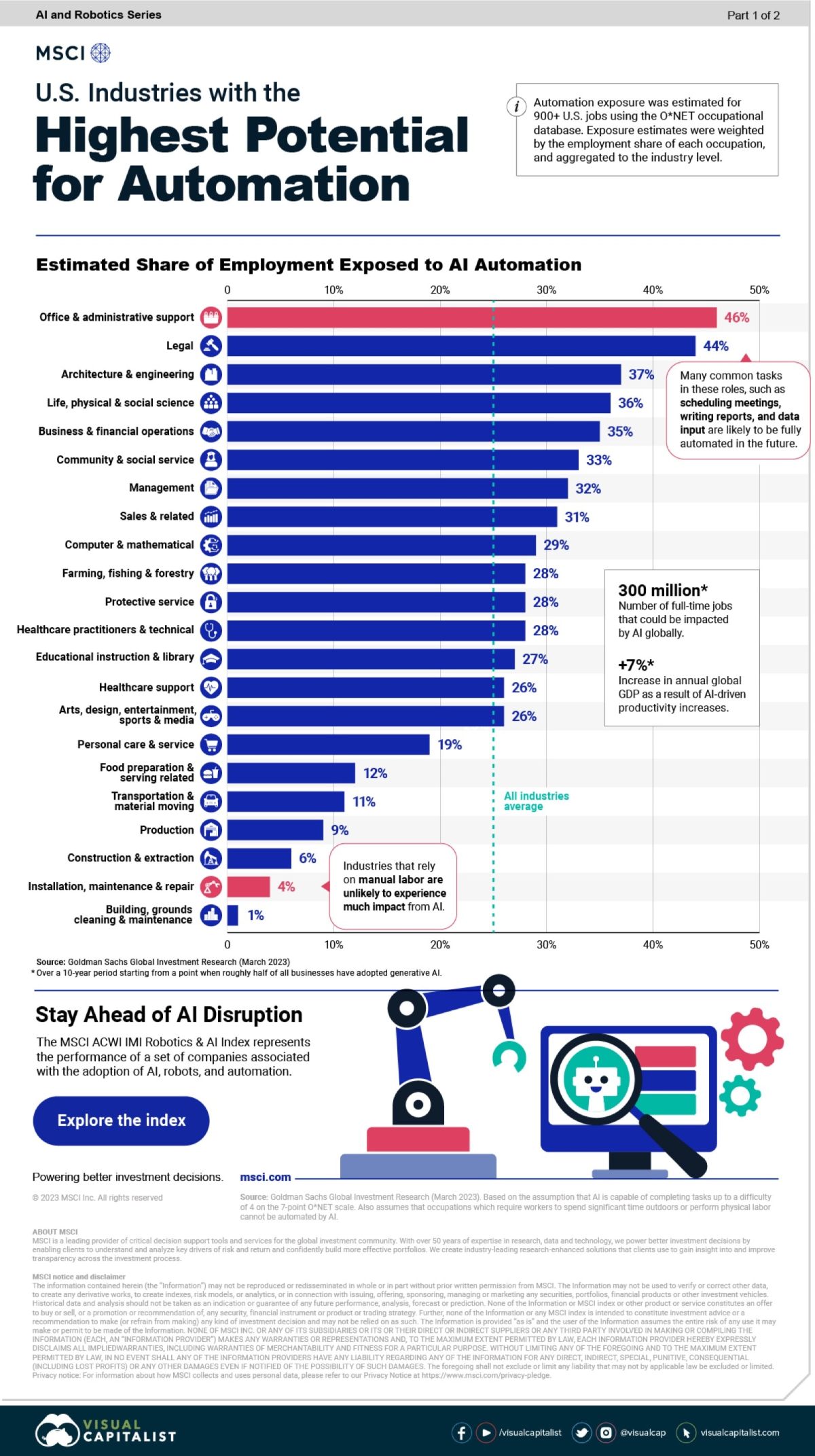 The data collected for the infographic comes from a 2023 report by Goldman Sachs Global Investment Research. The authors estimated automation exposure for over 900 U.S. jobs. The estimates were then weighted by the employment share of each occupation.