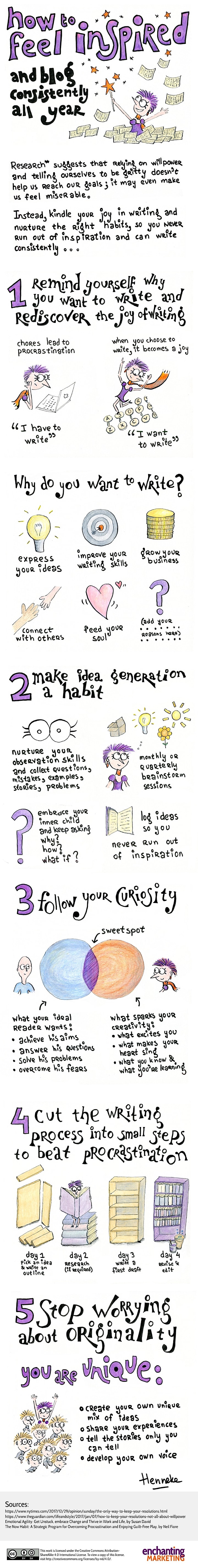 I’ve just discovered a wonderful infographic about how to get inspired to write consistently all year long. In simple words, the visual highlights the importance of writing consistently, and provides simple tips on how to achieve it.