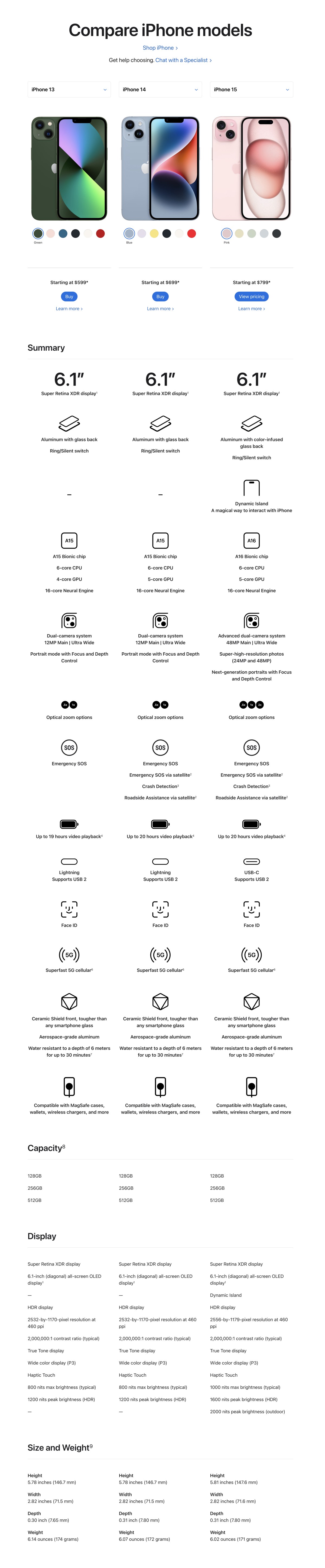 Find below a screenshot of the table comparing the latest iPhone 15 with iPhone 14 and 13. You can find all the details at Apple’s online store.