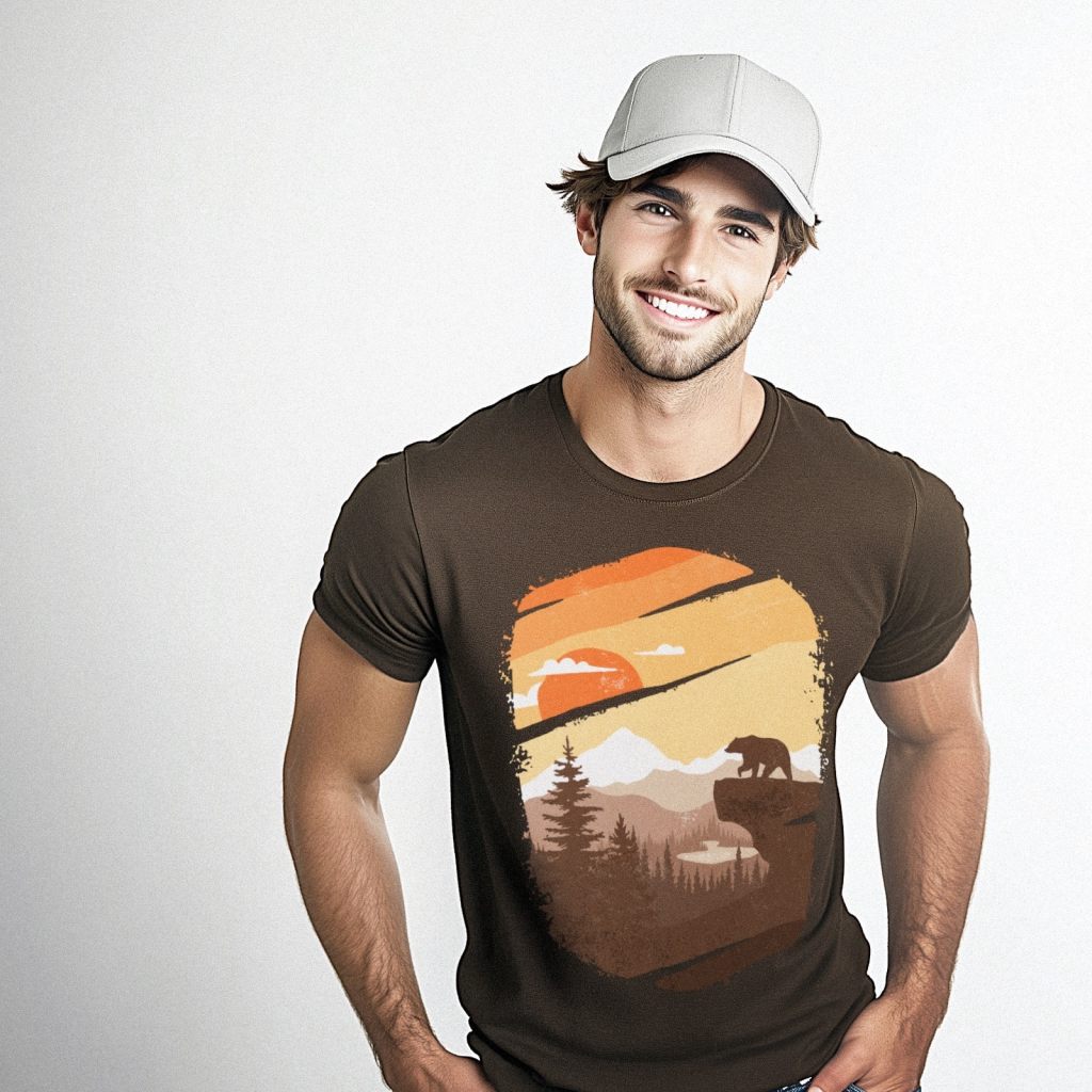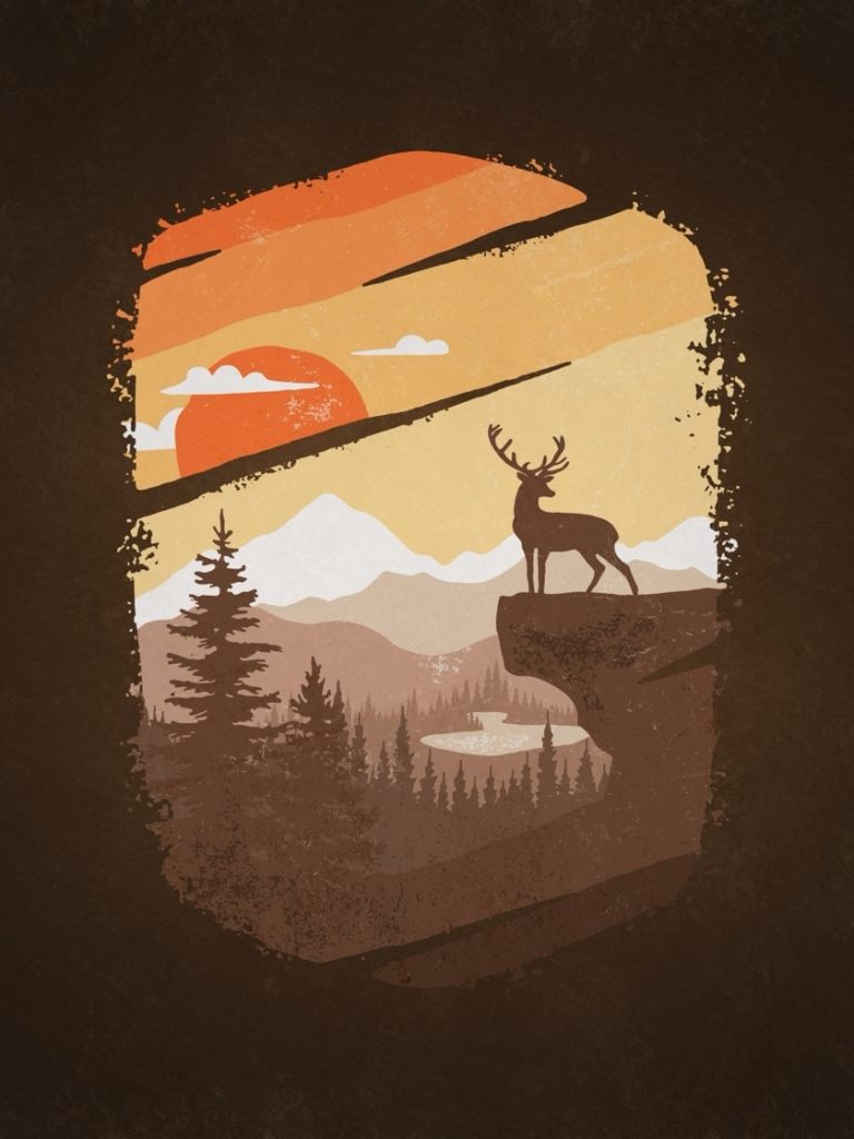 I wanted to capture the serene beauty of the wild with this vintage design. Set within the distressed shield-shaped frame, this retro graphic shows a deer (or bear) standing on a rock and overseeing the pine forest and mountains.